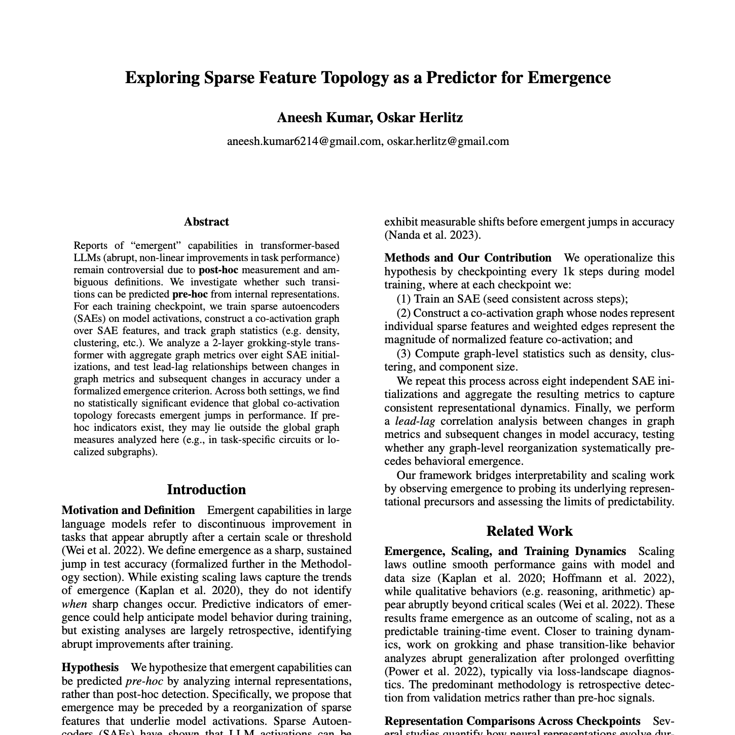 Aneesh Kumar co-authored Exploring Sparse Feature Topology as a Predictor for Emergence, a paper accepted to the AAAI XAI4Science 2026 Workshop and soon to appear on OpenReview. The study investigates whether âemergentâ capabilities in transformer-based models) can be predicted before they occur by analyzing internal representations rather than measuring them post hoc.
